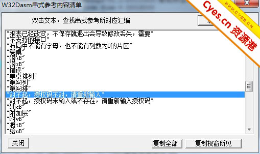 接着会弹出一个小窗窗,我们就来找找看吧,呦呦呦,还真被我们找到了,看到“对不起,授权码不对,请重新输入”这行了没有,就是它了,如下图: