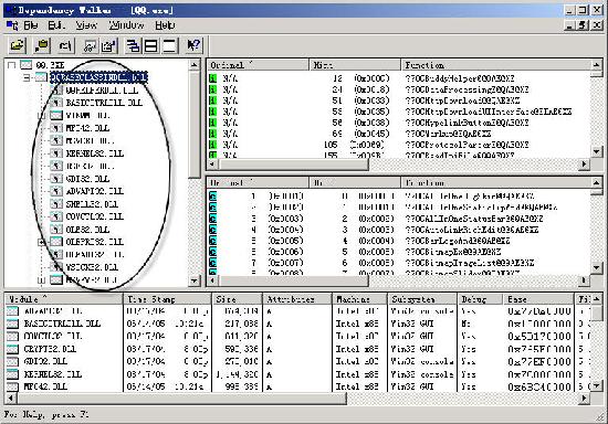还是拿QQ来作为例子,在Depends中打开QQ.exe,这时界面左侧的树状列表中显示的就是QQ.exe调用的DLL列表(见图2),如果展开这些DLL分支,还会发现其他的DLL,这就说明QQ调用的这些DLL文件还有可能(几乎是肯定)再调用别的DLL。这就好比买了一台新的DVD机,可能其中用的机芯是SONY的,而这个机芯里的一个小电容又有可能是别的公司的,这是同样的道理。