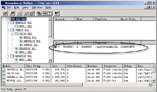 “千千静听”的插件目录在该软件安装目录下的Addin子目录下,程序的插件目录一般都会以“Plugins”、“Addin”来命名。在“千千静听”的插件目录中有许多DLL文件,比如tt_asf.dll、tt_rm.dll等,从文件名中就能看出这些DLL是用来让这个播放器支持各种不同类型的音频文件的。同样,用Depends打开这些文件,你就会发现这些文件的输出函数表中都包括一个同样的函数:ttpGetSoundAddIn(见图4)。