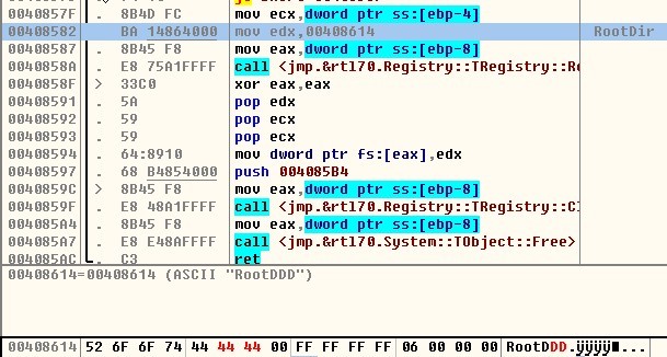 打开Delphi目录下的delphi32.exe文件,载入OD,找到"RootDir"这字符串,把"RootDir"这字符串改成"RootDDD",这样很简单就解决了..Delphi也正常使用了....也解决了被感染问题...(SysConst.dcu必须为正常的)..