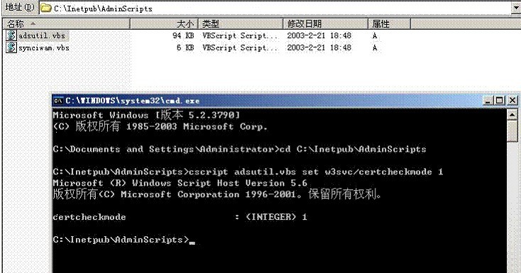 (2)输入:cscript adsutil.vbs set w3svc/certcheckmode 1(WIN2003+IIS6)