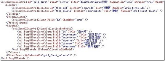 再看下EasyUI.DataGrid,这个控件封装时间最长,也最繁琐,如图-8和图-9所示.我们不需要在前端写一堆DataGrid配置代码了,全部封装至底层,这种代码写一次就够了.