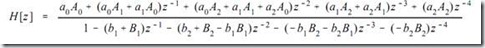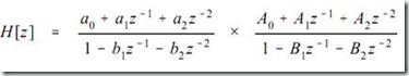 图4所示的带通滤波器由一个低通滤波器和一个高通滤波器串联而成。设两个滤波器的系数分别为a0、a1、a2、b1、b2和A0、A1、A2、B1、B2,则整个系统的传递函数H[z]由两级传递函数相乘得到