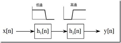上面的程序只能用于获取高通或低通滤波器的系数,对于带通滤波器,则需要再进一步进行构造。在DSP系统中,带通滤波器可通过低通滤波器和高通滤波器级联而形成,如图4所示。
