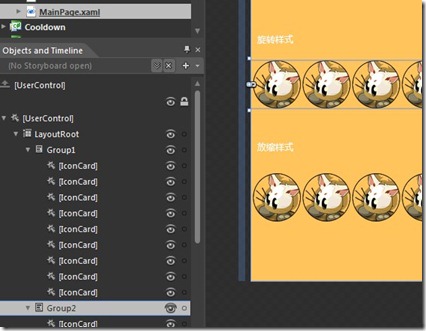 这段代码的意思是,从Group1这个控件中取得一个元素,转换元素成为IconCard控件,如果为null就不是,否则就可以制定一个索引给它,而它的索引属性会帮我们更改,这个操作你可以参照上面的内容在Blend里完成,而后面的代码是指定变换的中心点为整个控件的(50%,50%)位置,并且指定一个放缩变换给它,不要着急我们后面会用上。