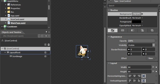 为了方便控制,把UserContorl的大小设定为64x64,在LayoutRoot里面添加一个Image控件,起名为IconImage,这个我们会在自定义属性中控制图片的来源:
