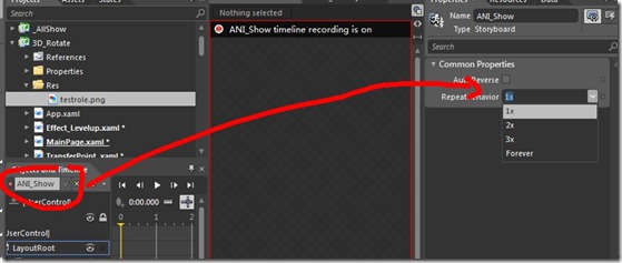 此时此刻这个故事板动画还是单向,我们要做成循环的动画,下面选择动画的名字,在播放模式地方选择Forever,现在这个效果会在0-360度的动画循环了。