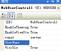 编译之后在客户端我们就可以访问到这个UserName属性,对其进行赋值取值操作,在客户端的用户控件属性一栏看到被公开的UserName属性: