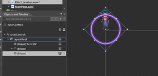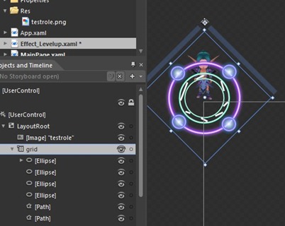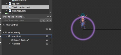 然后我们在Mainpage里简单的写一些逻辑和代码,请注意此事我已经将中间的升级按钮命名为btn_levelup,特效动画命名为effect_Levelup,升级特效的控件中的故事板动画名字为ANI_Show