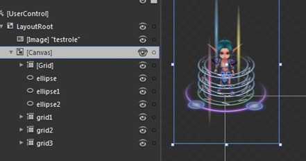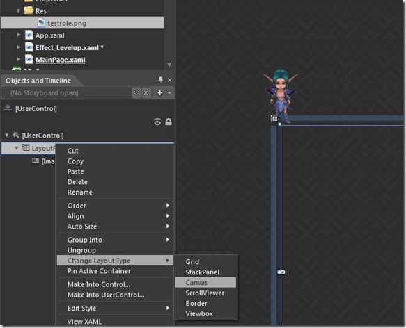 为了操作起来方便,建议将LayoutRoot转换成为Canvas控件,为什么要将角色这么放置,需要了解Silverlight的容器概念,控件的位置定位是按照左上角定位,这和屏幕的关系是一样,所以这样做的做法是让未来的控件直接和角色的中心点对齐(Center)。