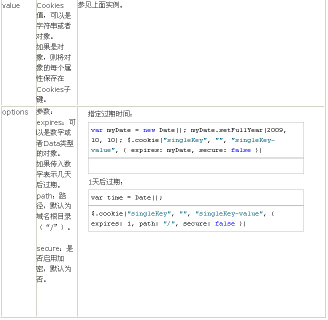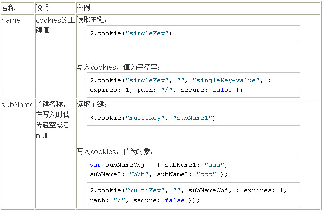 方法签名: jQuery.cookie(name, subName, value, options)