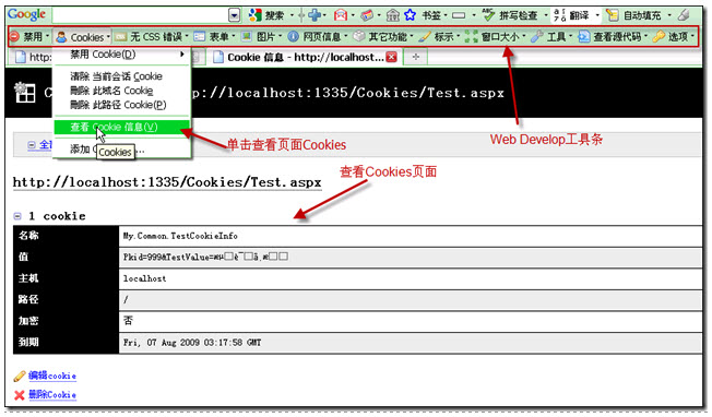 FF下使用Web Developer插件可以很方便的查看、删除和修改Cookies: