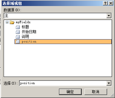 在"选择域或组"窗口中的数据源下拉框中选择主数据源中的"position"字段,然后点击确定。