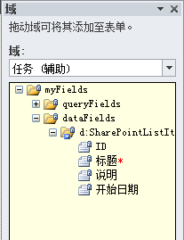 添加一个从SharePoint库或列表接受数据的连接,需要注意的是一定要勾选"在打开表单时自动检索数据"。在这个例子中我连接的是一个任务列表,在这个数据连接中包含了"ID"、"标题"、"开始日期"、"说明"四个字段。数据连接创建好后可在域面板中的看到下面的画面。