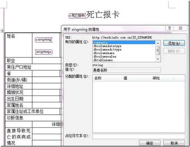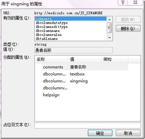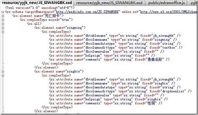 iv. dbtablename 结点所属Db表名称 dbcolumnname 结点所属Db表中列名称 dbcolumndatatype 列数据类型,如int,varchar等 dbcolumnedittype 列编辑类型,如textbox,dropdownlist dbcolumnvalue 列栏值,若编辑类型是下拉菜单,则数据值写入此属性 helpsign 公用帮助标识,如民族,疾病等 comments 列中文含义,可用于必输项检测,弹出提示内容