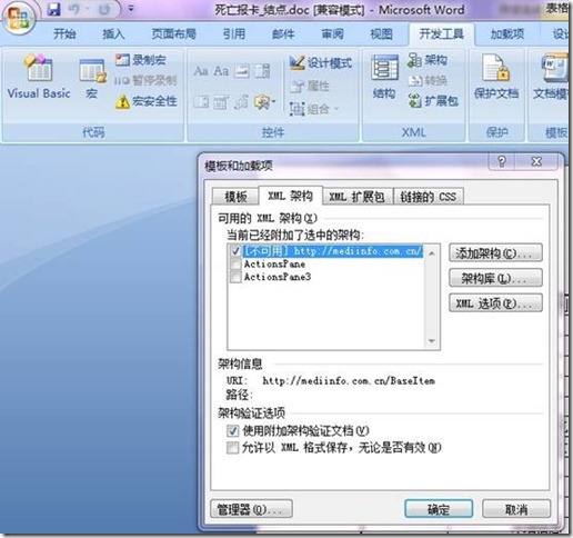 c) 完成xsd文档的编写,我们就需要将xsd文档并入Word中,因为我们使用结点方式操作数据