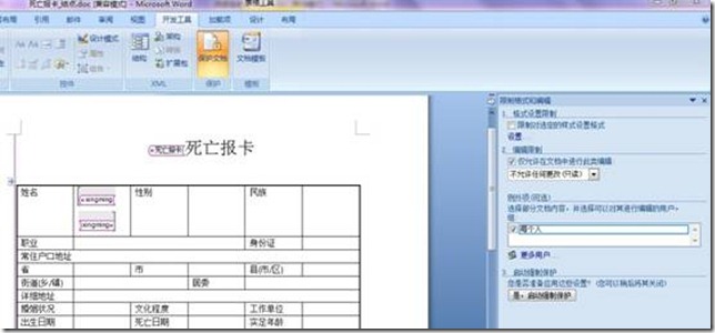 viii. 通过上述步骤,我们完成了报卡的设置工作,到此我们就可以通过编码方式对文档操作,包括结点取值和赋值,结点自定义属性取值和赋值.不过,如果直接拿给客户使用,会造成某些文字误删,因此,还需要对文档进行保护处理,同时,设置好只允许客户编辑的区域