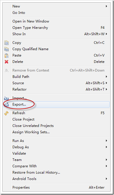 由于我这里的公共项目并不是一个Android常规项目,我只希望它充当一个公共的类库,提供一些通用功能,因此我将此项目创建为一个普通的Java项目,然后再Libraries中去掉了Java-SE的引用,加入了Android.jar(这个请根据需要,从SDK中导入特定版本的Android.jar文件),然后执行导出: