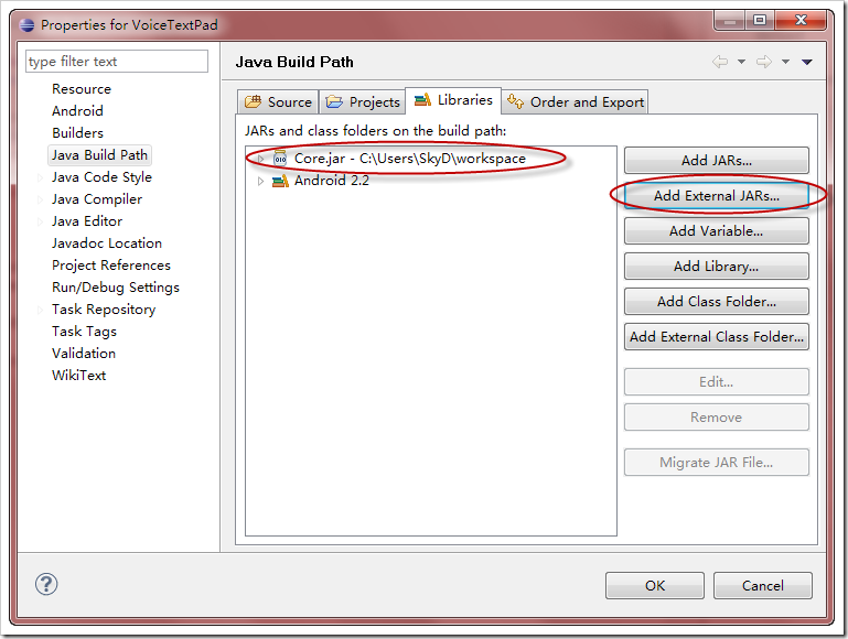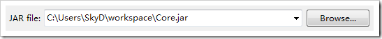 现在需要在要用到的项目中导入先前导出的jar文件,只需在Build Path中通过Add External JARs…功能选取先前导出的jar文件即可: