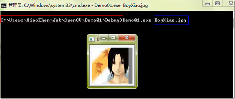 至于程序的执行的话,必须到命令行下执行,同时还需要将一张图片拷贝到 exe 文件所在的目录,然后再在命令行中指定该图片作为参数传递到 Main 函数中。