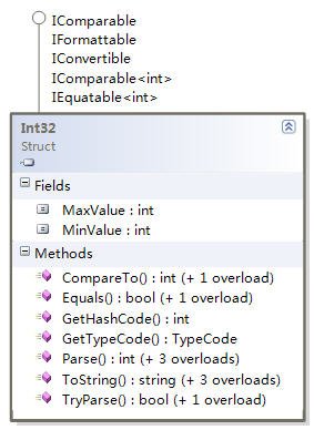 但从探索技术内幕而言则大不一样,Java使用Integer一个类就“搞定”了所有常用的整数处理功能,而对于.NET的System.In32结构,好奇的朋友不妨用Reflector去查看一下相关的源码,会发现System.Int32在内部许多地方使用了Number类所封装的功能,还用到了NumberFormatInfo(提供数字的格式化信息)、CultureInfo(提供当前文化信息)等相关类型,如果再算加上一堆的接口,那真是“相当地”复杂。