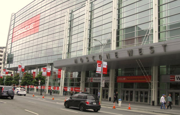 不过,城里已经另外一番景象,一年一度的JavaOne和Oracle OpenWorld已经悄然改变了城市的节奏:街上人明显多起来了,宾馆和餐馆也开始爆满,公交车、出租车、路边电线杆、就连地面上的人行道,都贴上了JavaOne和OpenWorld的宣传画。Oracle的营销确实很老练,这样的技术盛会已经驾轻就熟。OpenWorld主会场外也已经张灯结彩,迎接第二天的开幕。
