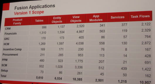 硬件之后,接下来说软件。Oracle准备把新一代业务系统都搞到新一代的软禁平台Fusion上去,把让人头大的多个版本的ERP系统——Business Suite,PeopleSoft、Seibel、JDE等都挪过去。这个技术远景非常诱人,不过其工作量的巨大可以想象!光看第一版就要包含多少模块。埃里森自己都说绝不想再干第二次。当然他号称每年投入40亿美金研发费,财大当然就气粗了。不过这都是技术远景,Oracle一如既往的是先说再干(美国公司大多都这样),和SAP干完再说的德国式风格依旧是泾渭分明。