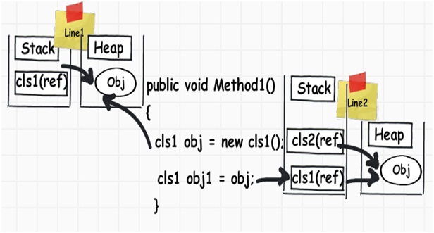 第3行:在第3行,我们创建了一个对象。当该行执行时,编译器在站上创建了一个指针,真实的对象存储在另一种叫“堆”的内存中。"堆"并不跟踪运行内存,它更像一堆随时可以访问的对象。堆用于动态分配内存。这里需要着重说明的是引用指针是分配在栈上。声明Class1 cls1时并不会给Class1的实例分配内存,而是分配一个栈变量cls1(并设置为null),然后把它指向“堆”。