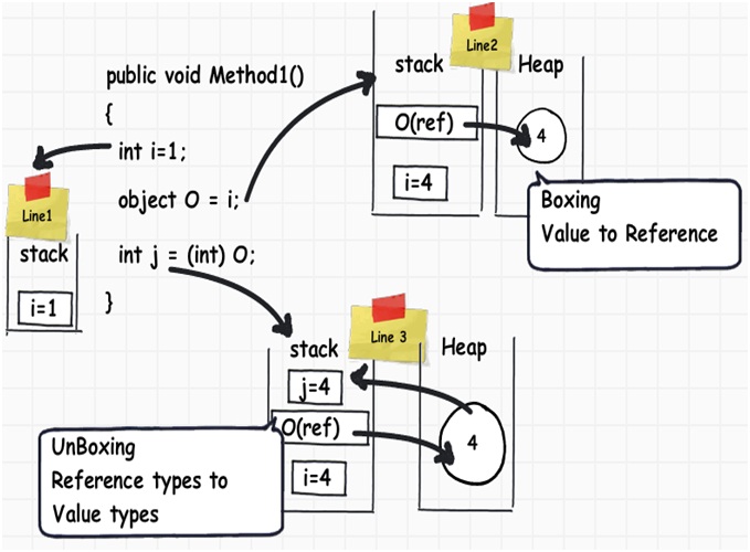 通过上面学习,我们学到了很多有用的东西,其中最有用的是明白了当把数据从栈移动到堆上时会有性能损失。如下图实例,当我们把一个值类型装箱为引用类型时,数据从栈移动到堆上。反之,数据从堆移动到栈上。这种在堆和栈之间的移动带来了性能的损失。数据从值类型转变为引用类型的过程称为“装箱”,反之为“拆箱”。