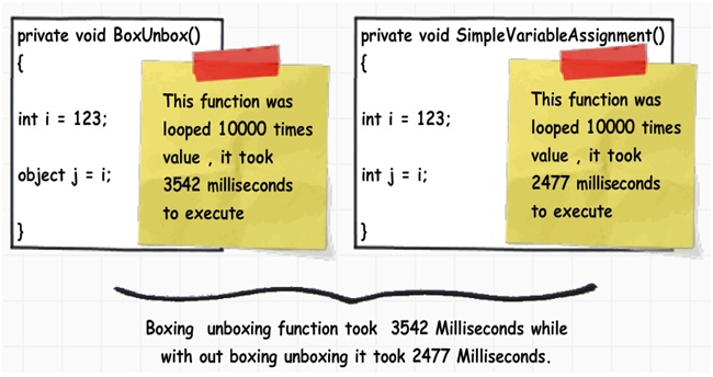 为了揭示装箱拆箱如何影响性能,我们把下面代码运行10000次。一个函数有装箱操作,另一个只有简单代码。我们用简单的计时器看它们的运行时间。装箱函数耗时 3542 MS,无装箱操作的耗时2477MS。这说明在实际项目中,除非必须,否则应避免装箱,拆箱操作。