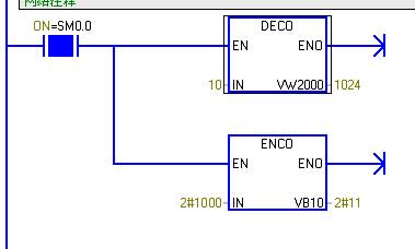 DECO是将VW2000的第十位置零(为十进制的1024),ENCO输入IN最低位为1的是第3位,把3写入VB10(二进制11)。