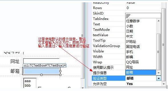 Step 2:拖入一个验证控件 选择验证类型,能否为空,提示信息等自己所需要的东西,这个例子中,我只选择了验证类型为邮箱,然后默认的允许为空改成了NO,不允许为空,其余都使用默认设置,