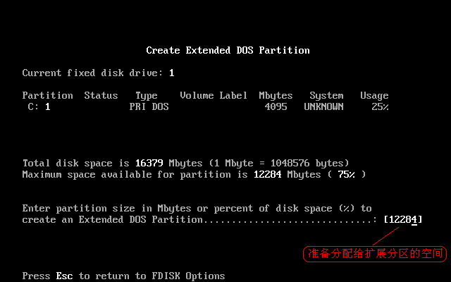 因为硬盘上只能有主分区(最多可设4个)、扩展分区(逻辑分区在扩展分区里)和空闲空间(即未分配空间)三种,如果不将除主分区之外的所有硬盘容量分配给扩展分区,就会产生无用的空闲空间做成浪费,因此这里标示出来的容量不能更改,直接按Enter回车键后,出现如下图17所示。