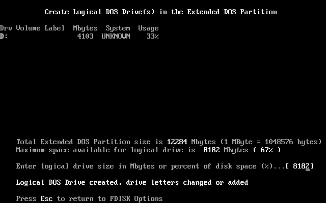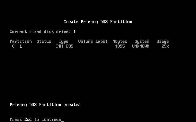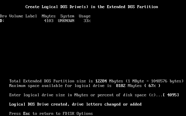 上图中显示出刚创建的主分区(C盘)的参数∶大小为4095MB。主分区建好了,提示按“Esc”键退回主菜单。按Esc键后,退回主菜单出现如下图12所示。