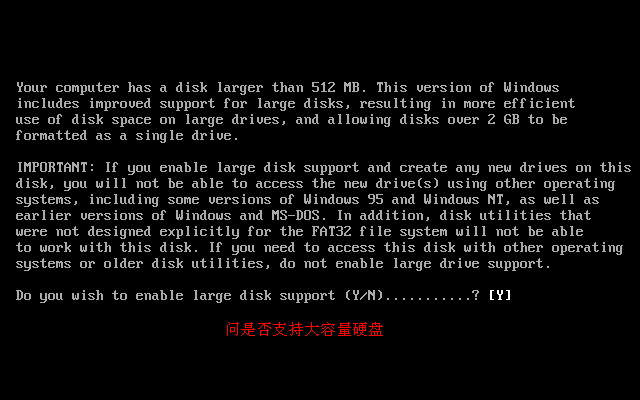 上图中,问是否支持大硬盘。当然选择“Y”支持。按Enter回车键后,出现如下图3所示。