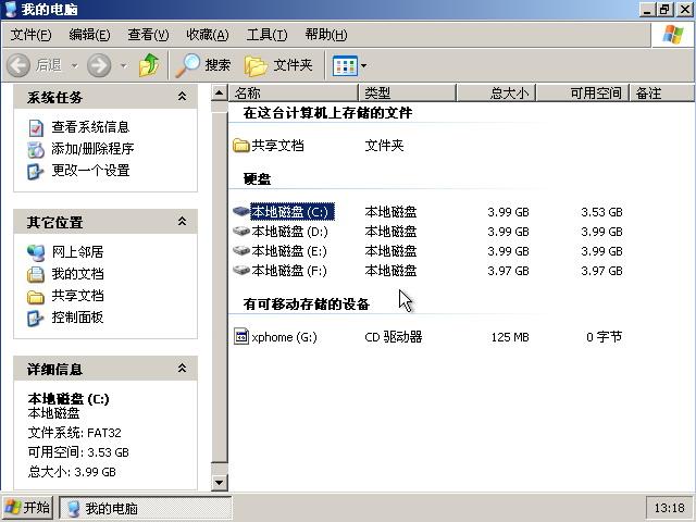 我把各分区格式化为FAT32文件系统后,安装了XP系统,打开“我的电脑”显示如下图36所示。