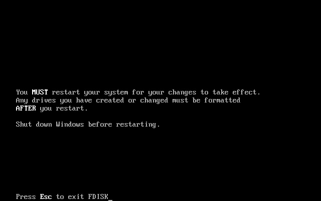 提示要重新启动系统使设置生效,所有更改的分区在重启后格式化才能使用。按“Esc”键退出fdisk程序,出现如下图34所示。