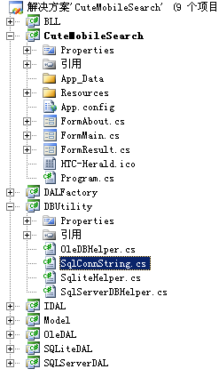 其中DBUtility为公共数据访问类库。三个数据访问层SQLServerDAL、SqliteDAL和OleDAL分别对应sql server、Sqlite、Access数据库。这里我正在使用的是SqliteDAL。