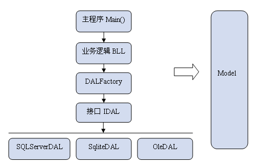 主程序调用业务逻辑层BLL,BLL使用抽象工厂DALFactory方法,DALFactory创建DAO实例对象,接口层IDAL定义数据操作接口方法,由数据访问层通过各自的公用数据操作类库进行读写数据库,实现对实体类Model的访问。