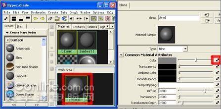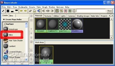 4、在Hypershade超级滤光器中,点击左边的Blinn按钮,创建一个布林材质球,如图4所示。