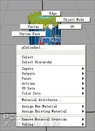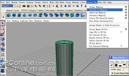 5、选择圆柱体所有的面,然后执行Create UVS-Cylinder Mapping菜单,设置为圆柱贴图坐标,如图5所示。