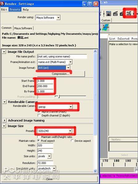 24、点击Render Settings按钮,打开面板,并在Common中设置渲染格式为AVI(读者可根据自己的需要选择不同的格式),并设置渲染超始帧及摄像机,如图24所示。