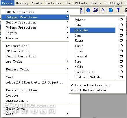 1、打开Maya软件,执行Create—Polygon Primitives—Cylinder菜单。如图1所示。