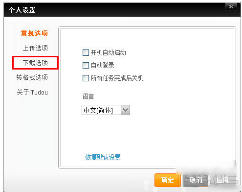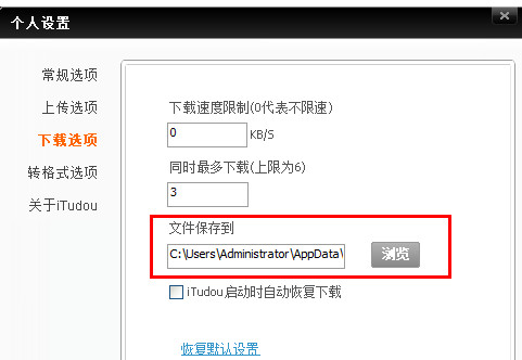 3、接下来,在下载选项中,我们可以对下载的速度和数量进行限制设置。还可以看到itudou 视频下载文件存放的路径。系统默认会把下载的视频文件存放在 C:盘目录中。当我们视频下载多了,视频占用C盘的空间也会越来越大,导致系统运行速度缓慢,并且默认的存放路径也不便于我们查找和打开。