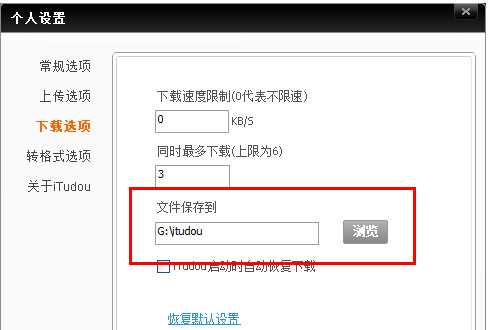 4、我们可以更改下载视频存放的地方,点击“浏览”,例如,我在 G:盘新建了一个名为 itudou 的目录,然后把下载视频的位置更改为G:itudou,然后点击“确定”。