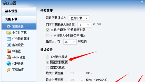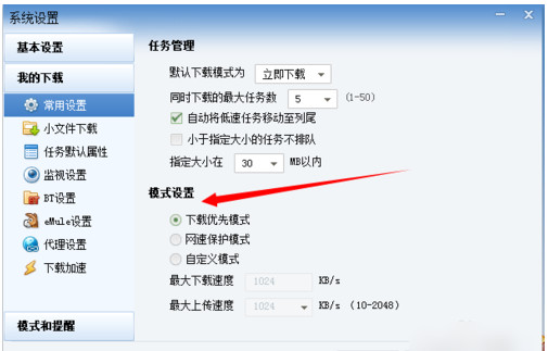 进入我的下载以后,就是常用设置了。在常用设置下,找到“模式设置”。在模式设置中,可以看到迅雷是默认的下载优先的模式。