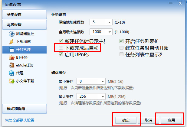 方法二:右上角点击下拉配置中心==高级设置==任务管理==下载完成后自动关机