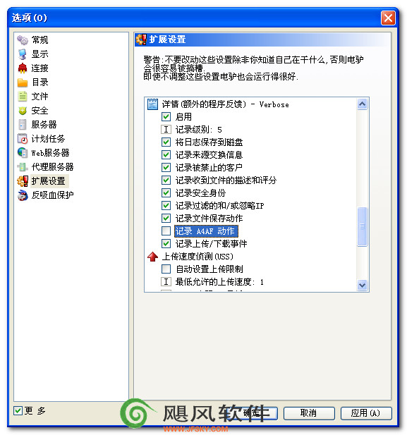 常规: 1) 不要选中“显示欢迎窗口” 显示: 1) “进度条样式”滑动至扁平。 2) 不要选中“在标题栏中显示传输比例”。 3) 不要选中“在分类标签上显示下载信息”。 4) 选中“禁用已知客户列表”。 5) 选中“禁用排队列表”。 6) 选中“更改尺寸后不重建统计图形”。 连接: 1) 不要选中“显示额外开销的带宽”。 2) 根据你的网络连接情况填写合适的上传和下载数据。 服务器: 1) 选中“移除无响应服务器,在1次重试后”。 设置统计信息显示: 1) 增加时间间隔 (图形更新间隔,统计信息树更新间隔)。 2) 如果你根本不需要这些图形,你可以把图形更新间隔滑动至最左边来禁用它。 3) 如果你根本不需要这些统计,你可以把统计信息树更新间隔滑动至最左边来禁用它。 扩展设置: 1) 不要选中“详细(额外的程序反馈)”。 2) 把“队列大小”滑动至最左边。 下载文件的数量: 不要同时下载大量的文件。eMule 不得不尝试同时处理大量文件和源,这可能会导致你被服务器禁止。