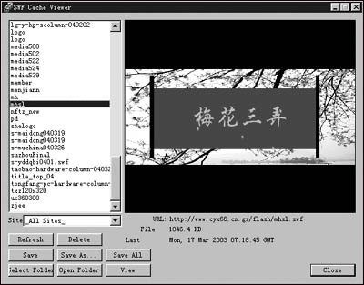 Flash Saving Plugin:将所有访问过的网站上的Flash全部记录下来了,想查看时只要点击“FL”图标,选择“SWF Cache→From This Site”(从当前访问网站)或“From AII Site”(从所有网站)就可以了(如图)。