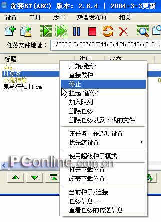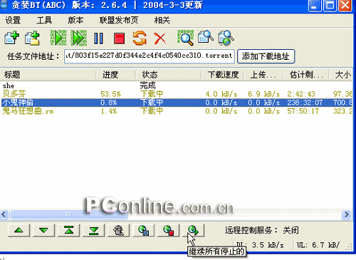贪婪BT的控制功能的一大特点是在主界面上方提供了一列人物控制按钮,下方也有一列控制按钮,这两组按钮上方的一组按钮只对当前所选中的这个下载任务起作用,下方的这组按钮是对所有的下载任务同时起作用,在操作上来说贪婪BT中可以随时对某个下载任务进行修改,是非常方便的。(图2)。